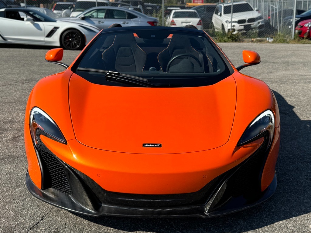 2015 McLaren 650s Spider. Clean CarFax! Loaded with Options! Original Car Manual Books! Two Keys! Tarocco Orange Metallic Paint on Full Carbon Black Alcantara Sport Interior with Orange Stitching and Carbon Fiber Trim. 3.8L V8 Twin-Turbocharged Engine and 7-Speed Automatic Transmission with Paddle Shifters, Producing 641 HP and 500 LB of Torque. Carbon Fiber Interior Upgrade. Carbon Fiber Exterior Upgrade. Carbon Fiber Side Intakes. Carbon Fiber Mirrors. Front Lift System. Meridian Surround Sound System. Racing Seats. Steering Wheel in Carbon Black Leather with Harissa Orange Stitching. Carbon Ceramic Brakes with Orange Calipers. Rear Camera. Front and Rear Parking Sensors. Adaptive Cruise Control. Bluetooth. SiriusXM. AM & FM Radio. CD Player Navigation System & Much More!